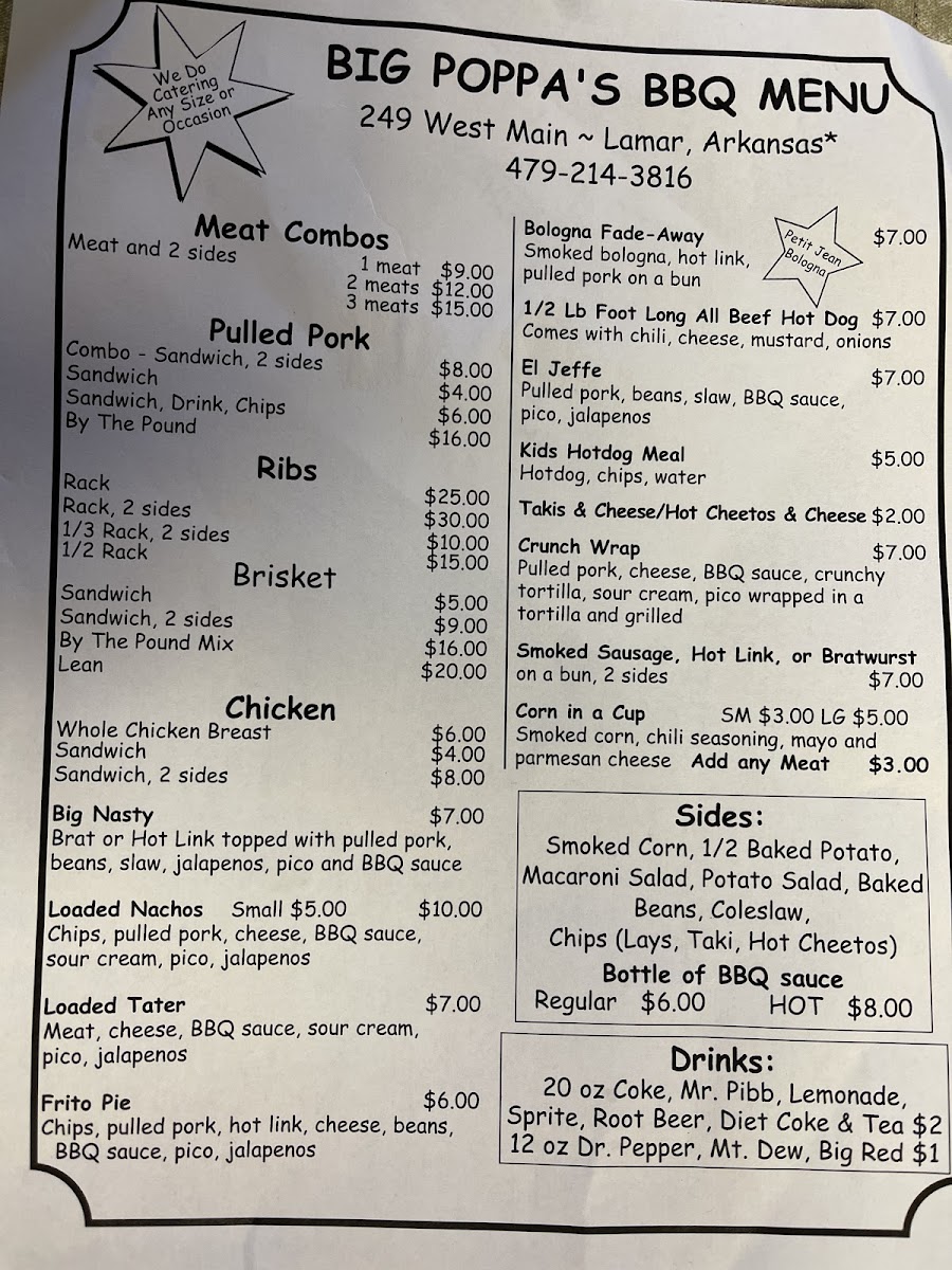 Welcome to Big Poppa's BBQ, nestled in the heart of Lamar, Arkansas! This grill paradise is a must-visit, offering a mouthwatering menu that will tantalize your taste buds. Indulge in their Whole Chicken Breast or dive into a hearty plate of Loaded Nachos. Don’t miss the renowned "Big Nasty" for a truly satisfying experience.